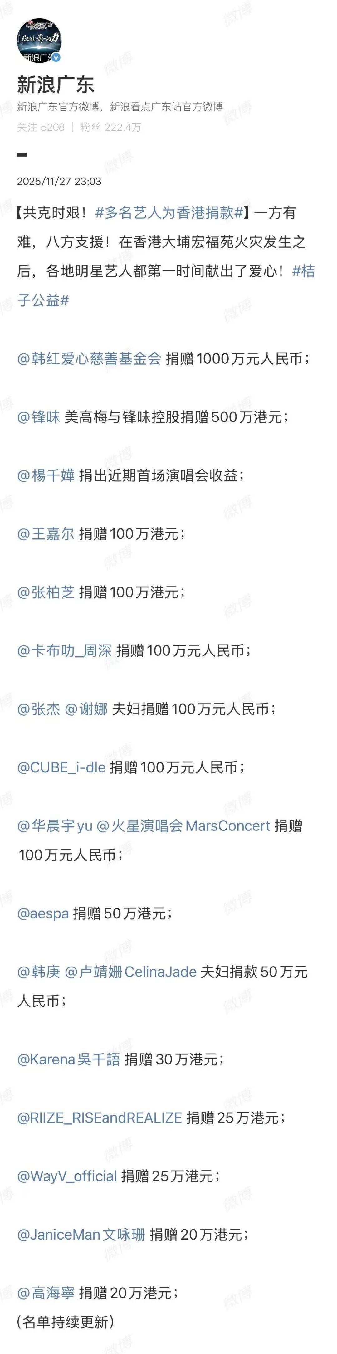 此外,据@新浪广东消息,王嘉尔、华晨宇、谢霆锋等明星也纷纷慷慨捐赠。