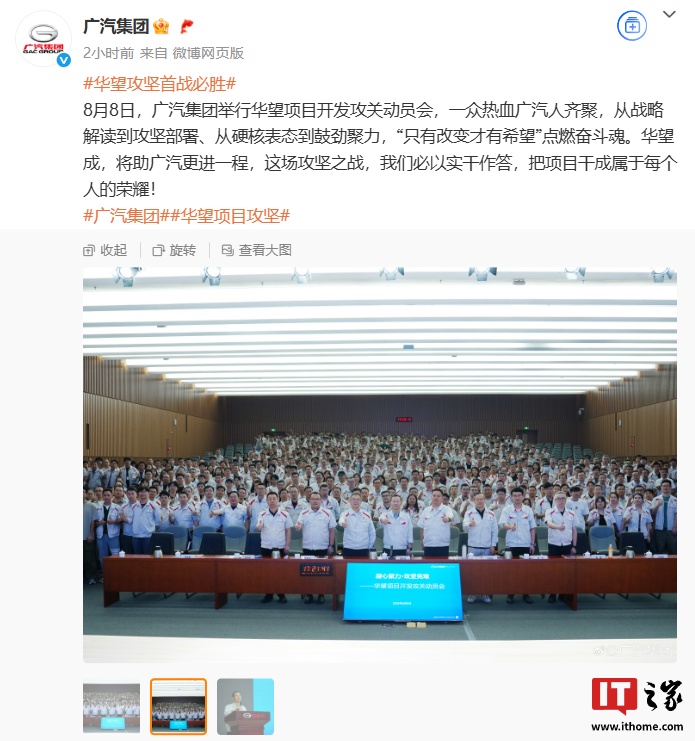 IT之家 8 月 10 日消息,广汽集团今日发文表态:华望攻坚首战必胜。据介绍,广汽集团在 8 月 8 日举行了华望项目开发攻关动员会,从战略解读到攻坚部署、从硬核表态到鼓劲聚力。官方表示,华望成,将助广汽更进一程。这场攻坚之战,必以实干作答,把项目干成属于每个人的荣耀。